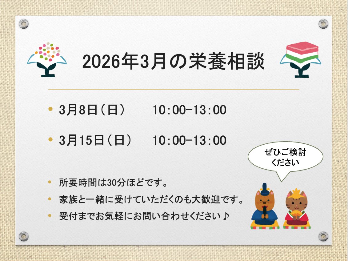 3月8日(日)と3月15日(日)で栄養相談を実施いたします。