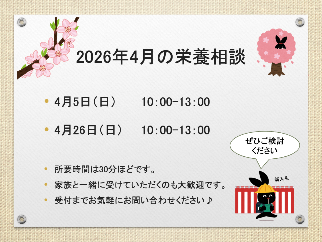 4月5日(日)と4月26日(日)で栄養相談を実施いたします。